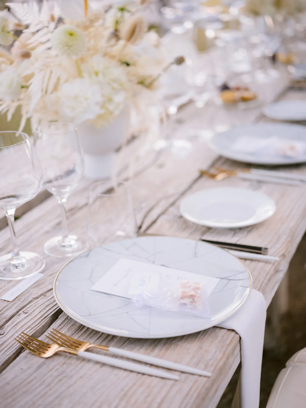 La décoration de ce mariage a été un défi des plus stimulants. En effet, la volonté de la mariée était de créer un décor plutôt moderne et épuré dans un espace méditéranéen au paysage foisonnant. C’est justement ce mariage paradoxal qui a rendu notre travail d’autant plus intéressant. La cérémonie a eu lieu dans le potager du Castello. Cette particularité apporte au mariage une dimension plus charmante encore à ce moment unique. Grâce à une collaboration des mariés et de notre équipe, nous assistons à la naissance d’un décor élégant qui viendra contraster avec cette nature idyllique.