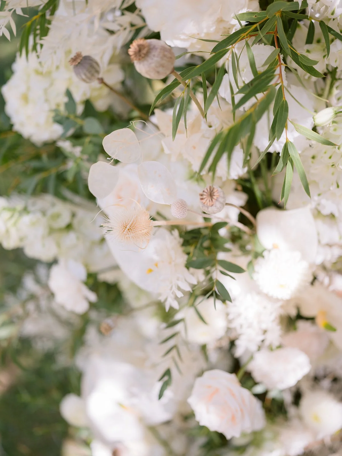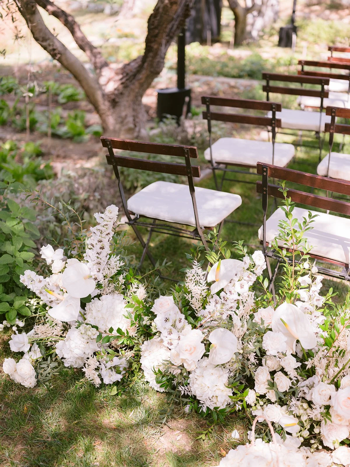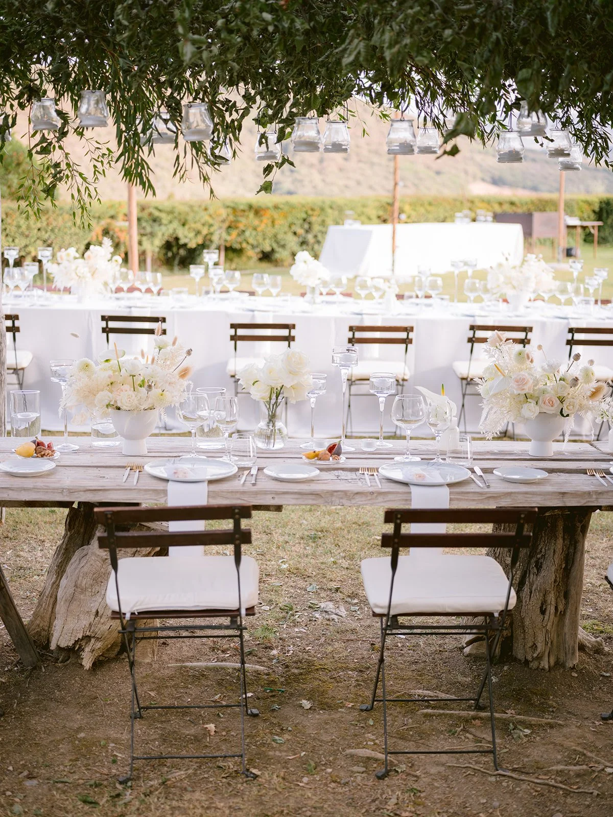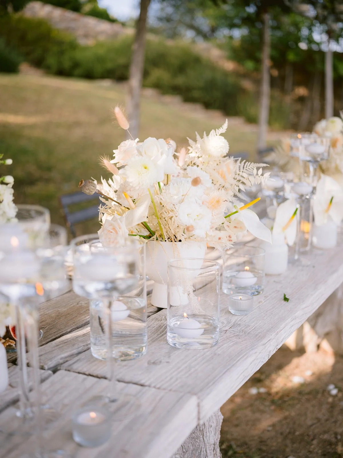 Decorating this wedding was an exciting challenge. Indeed, the intention of the bride was to create a rather modern and refined decoration in a Mediterranean space with a rich landscape. It is this unexpected choice that has made our work all the more interesting. The ceremony took place in the orchard of the castle that brought an enchanting dimension to the wedding. Thanks to the collaboration of the bride and groom with our team, we were able to create an elegant decor that contrasts with this rich and idyllic nature.