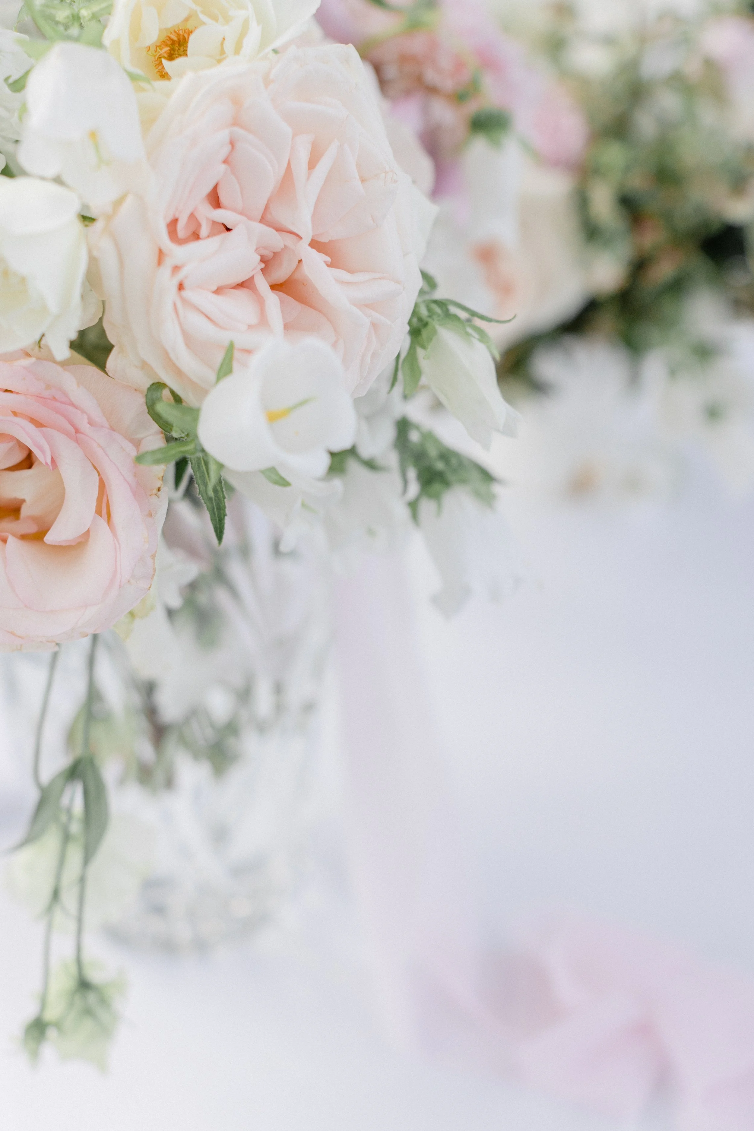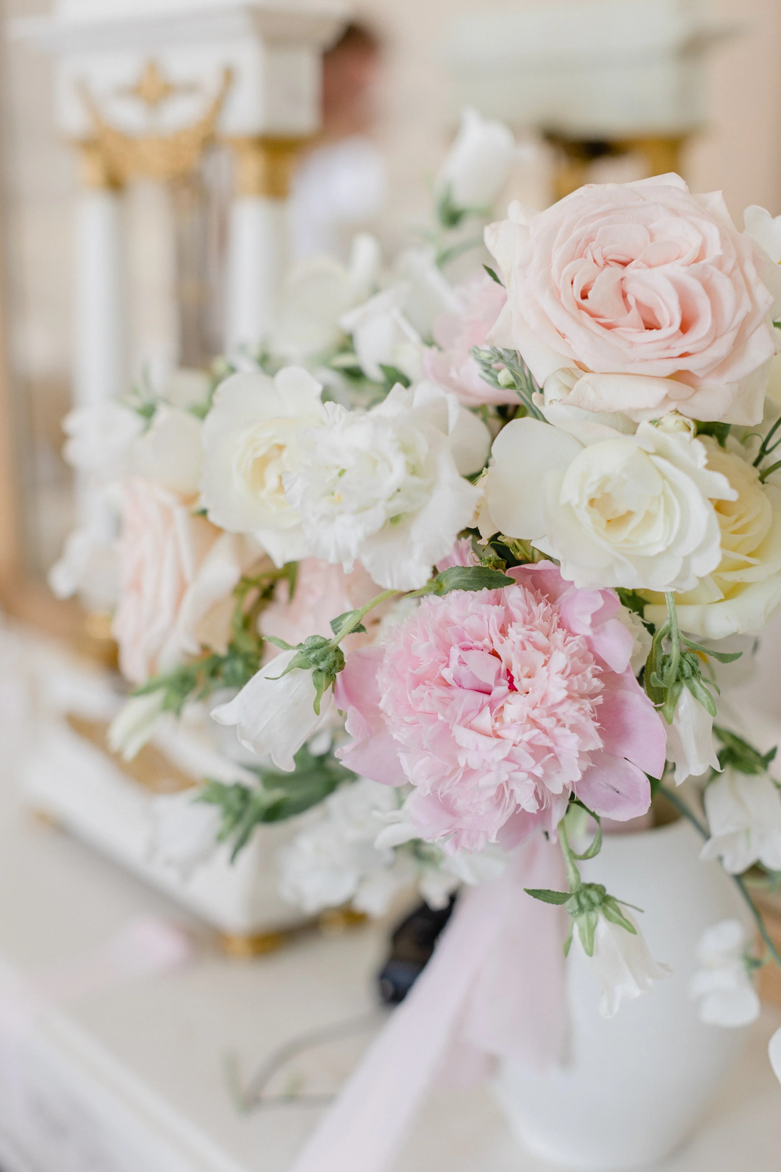 Ce mariage communicant une immense pureté nous a inspirés des tons doux avec du rose pâle ainsi que du blanc. Le choix des variétés des fleurs se devaient selon nous d’également faire émaner cette aura romantique recherchée. C’est pourquoi nous nous sommes portés sur des roses à l’anglaise à l’odeur enivrante. Afin de marquer l’entrée de cette chapelle qui nous a tant charmés, nous avons créé une arche florale toute en légèreté pour en souligner l’entrée.